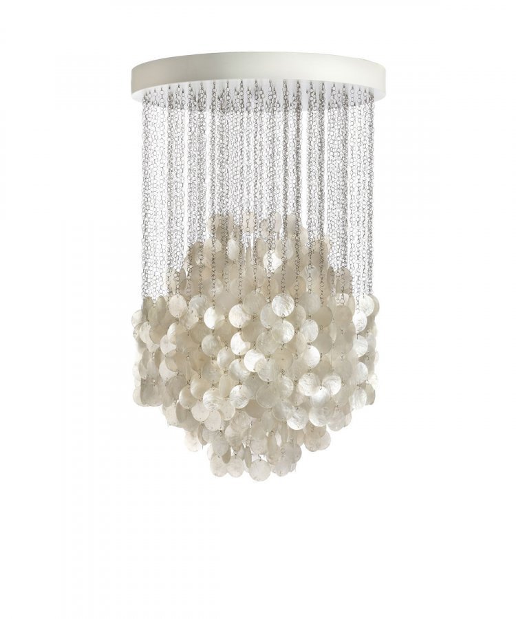 Design: Verner Panton for Verpan. Konsepti: Verner Panton suunnitteli FUN -valaisimen vuonna 1964. Valaisin koostuu helmiäiskuorista, joita metallirenkaat kannattelevat. Näin valo leviää ihastuttavalla tavalla valaisimen ympärille. Verner Panton (1926-1998) on eräs Tanskan värikkäimpiä arkkitehtuuriin ja muotoiluhistoriaan liittyviä henkilöitä. Panton valmistui Kööpenhaminan taideakatemiasta vuonna 1995, ja tunnetaan voimakasvärisistä, orgaanisista tuotteistaan, sekä rakkaudestaan muoviin. Hän on saanut useita tunnustuksia epätavallisesta ja uraauurtavasta työstään.
