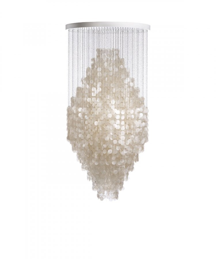 Design: Verner Panton for Verpan. Konsepti: Verner Panton suunnitteli FUN 8 DM -riippuvalaisimen vuonna 1964. Valaisin koostuu helmiäiskuorista, joita metallirenkaat kannattelevat. Näin valo leviää ihastuttavalla tavalla valaisimen ympärille. Verner Panton (1926-1998) on eräs Tanskan värikkäimpiä arkkitehtuuriin ja muotoiluhistoriaan liittyviä henkilöitä. Panton valmistui Kööpenhaminan taideakatemiasta vuonna 1995, ja tunnetaan voimakasvärisistä, orgaanisista tuotteistaan, sekä rakkaudestaan muoviin. Hän on saanut useita tunnustuksia epätavallisesta ja uraauurtavasta työstään.