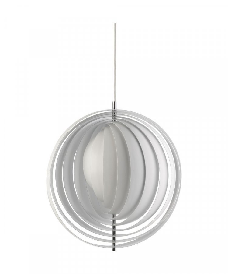 Design: Verner Panton for Verpan. Konsepti: Uskomattoman kaunis ja erilainen valaisin!. Verner Panton suunnitteli Moon-valaisimen vuonna 1960, ja nykyisin sitä tuottaa Verpan. Verner Panton oli värikäs persoona, jolla on kontollaan monta hullua, kaunista ja erityistä muotoilutuotetta. Verner olikin erikoisen ja liioittelevan muotoilun ystävä, joka kulki aivan omia polkujaan verrattuna saman aikakauden muihin muotoilijoihin. Moon -valaisin on valmistettu ohuista metallilamelleista, jotka voidaan asetella aivan kuten itse tahdot. Näin valo suuntautuu juuri sinne, minne haluat. Lisäksi luot omilla asetteluvalinnoillasi valaisimelle persoonallisen ilmeen. Moon sopii täydellisesti esimerkiksi ruokapöydän yläpuolelle, joko yksinään tai vaikkapa kahden valaisimen rykelmänä. Se näyttää fantastiselta myös olohuoneessa – ehkäpä huoneen kulmassa? Minne tahansa sen asetatkin, kaunistaa se kotiasi aivan erityisellä, upealla tavalla!