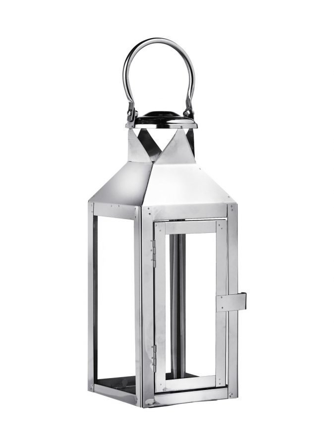Elegantti pikkulyhty valaisee pimenevässä illassa. Yhdellä sivulla on ovi kynttilälyhdyn sisään asettamista varten.
