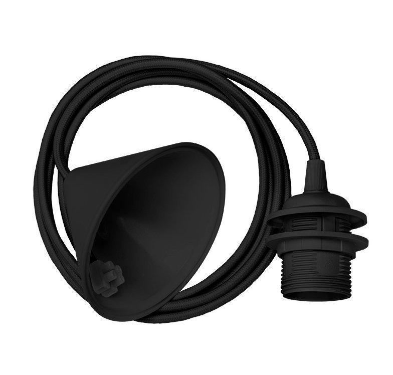 Vitan pitkä, musta tekstiilijohto ja muovinen kattokuppi. Yksinkertainen, tyylikäs ja sopii kaikkiin varjostimiin. Pituus: 2,1 m Korkeintaan 60 W (E27)