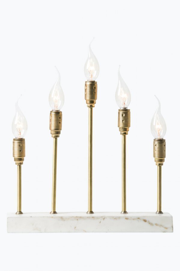 Klassinen Harriet-sähkökynttelikkö, jossa moderni ja tyylikäs malli. Messinkiä ja mustaa tai valkoista marmoria. Valitse 5xE14-lamput, niin saat kirkkaan valon. Kullanvärinen kangasjohto. Lamput eivät mukana. Korkeus 32 cm, leveys 32 cm, syvyys 8,5 cm. Pohjan leveys 32 cm, syvyys 8,5 cm.