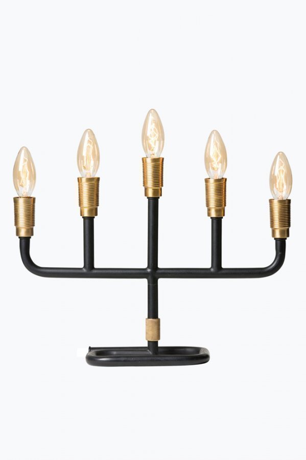 Tyylikäs ja erilainen, putkimainen Johan-sähkökynttelikkö! Mattamusta, jossa messinginväriset detaljit, tai messinginvärinen. Valitse 5xE14-lamput, niin saat kirkkaan valon. Musta tai kullanvärinen kangasjohto. Lamput eivät mukana. Korkeus: 30,5 cm, leveys:41 cm. Pohjan leveys 18 cm, syvyys 14,5 cm.