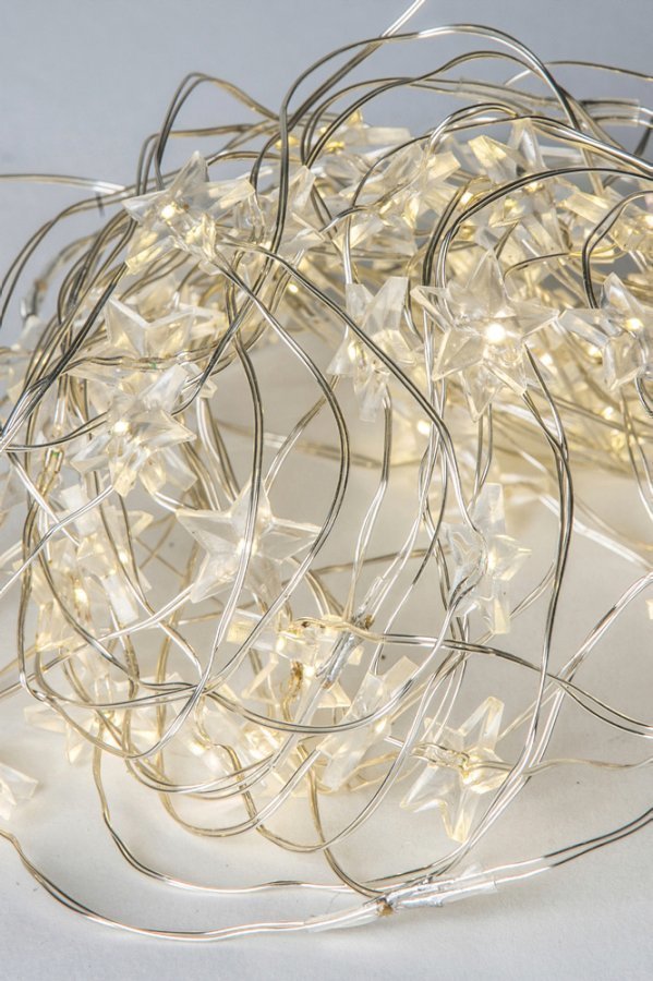 Paristokäyttöinen Micro Star 20 -valoköynnös, jossa tähdenmuotoiset lamput. Hyvä tilanteisiin, joissa haluat välttää verkkovirtajohdon, kuten vaikkapa illallispöydässä. Lämmin, valkoinen valo. Metallilankaa ja 20 LED-lamppua. Pituus 1,9 m. Paristoyksikössä 6 tunnin ajastin. Toimii kolmella AA 1,5 V:n paristolla. Pituus 185 cm.