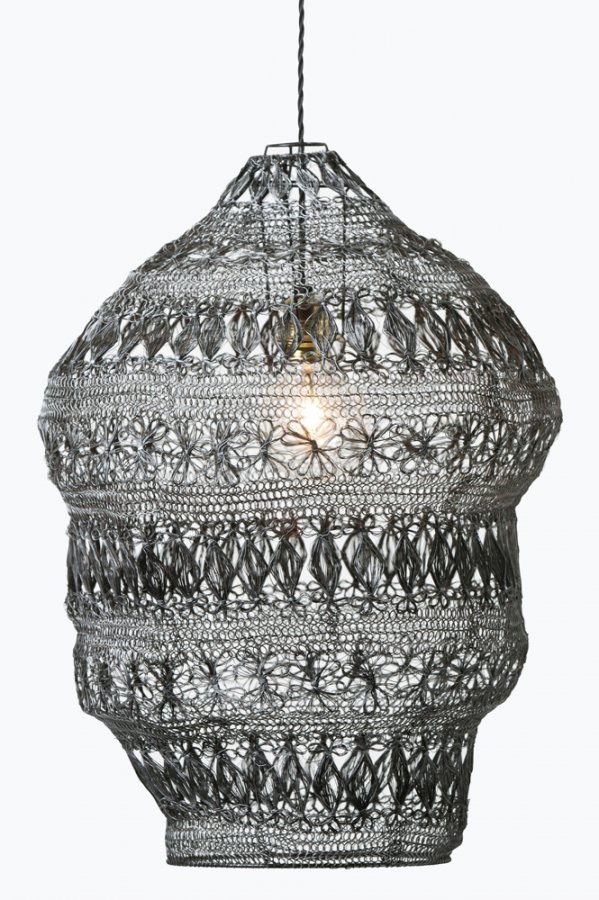 Kattovalaisimen Wilma-varjostin vie ajatukset käsityöhön. Varjostin on valmistettu kutomista muistuttavalla tekniikalla, mutta onkin rautalankaa! Lopputulos muistuttaa entisaikojen panssaripaidan materiaalia. Kattojohto ja lamppu eivät ole mukana. Korkeus 48 cm. Halkaisija 42 cm.