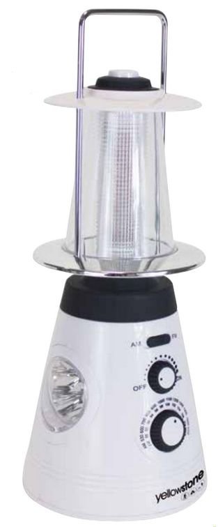 Yellowstone 20 LED Lantern lyhty radiolla Sisäänrakennettu AM / FM -radio 360° valaisu Mitat: 11.5 x 11.5 x 28cm Paino: 376g Paristo tyyppi: 3 x D (ei sisälly pakkaukseen) Paloaika: noin 18 tuntia Lampun tyyppi: 20 x 5mm Ultra Bright White LED YS LT037 Product features: – Built in AM / FM radio – 360° Illumination – Contemporary design – Torch function – Can be used with DC charger (not supplied)